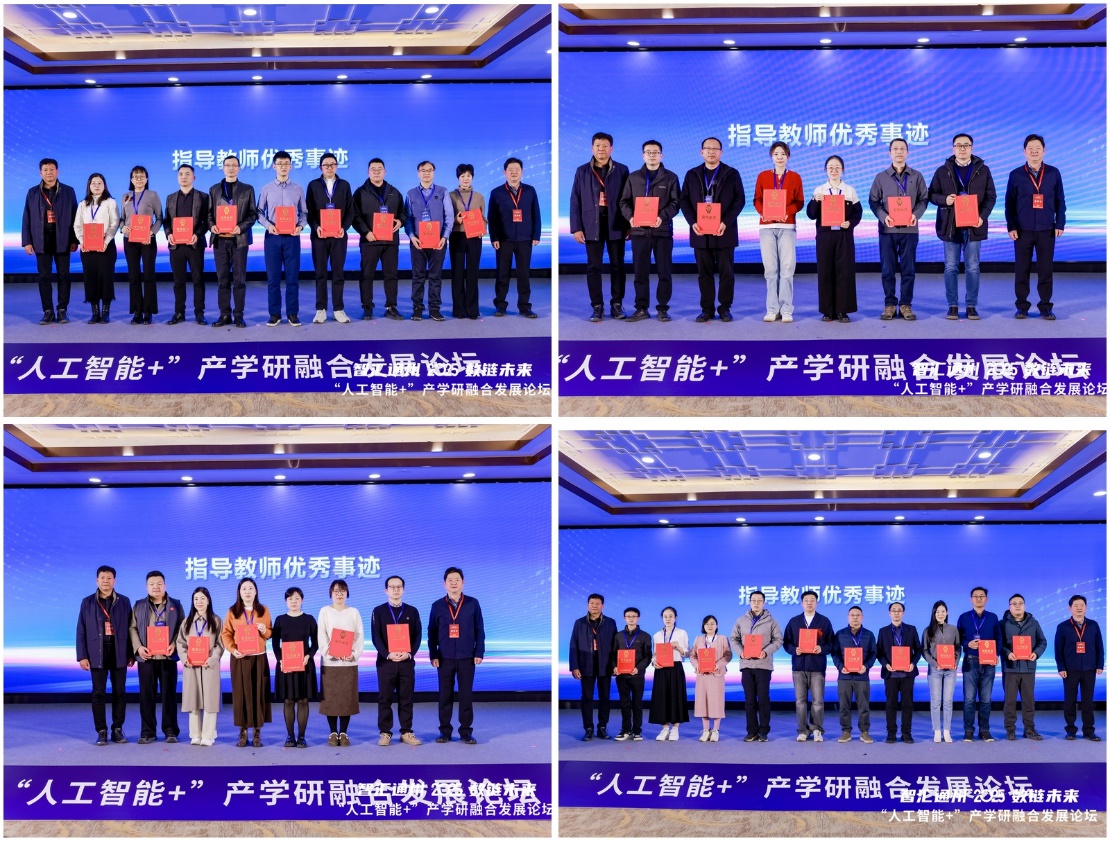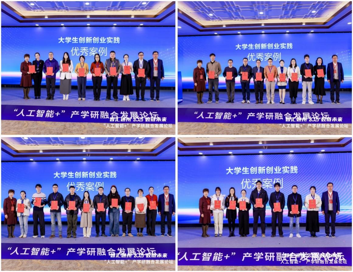 实盟副理事长、南京工业职业技术大学党委书记谢永华(左1),实盟副理事长、北京物资学院副校长张旭凤(右1)为“人工智能+”优秀项目获奖代表颁奖