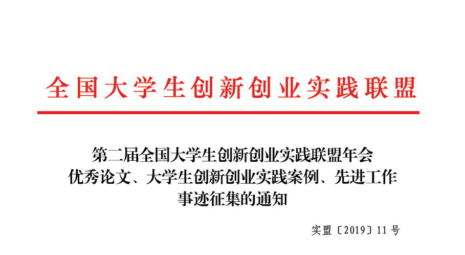 实盟〔2019〕11号_第二届全国大学生创新创业实践联盟年会优秀论文、大学生创新创业实践案例、先进工作事迹征集的通知